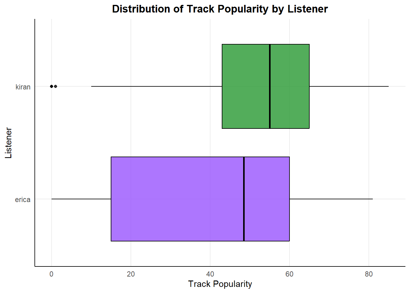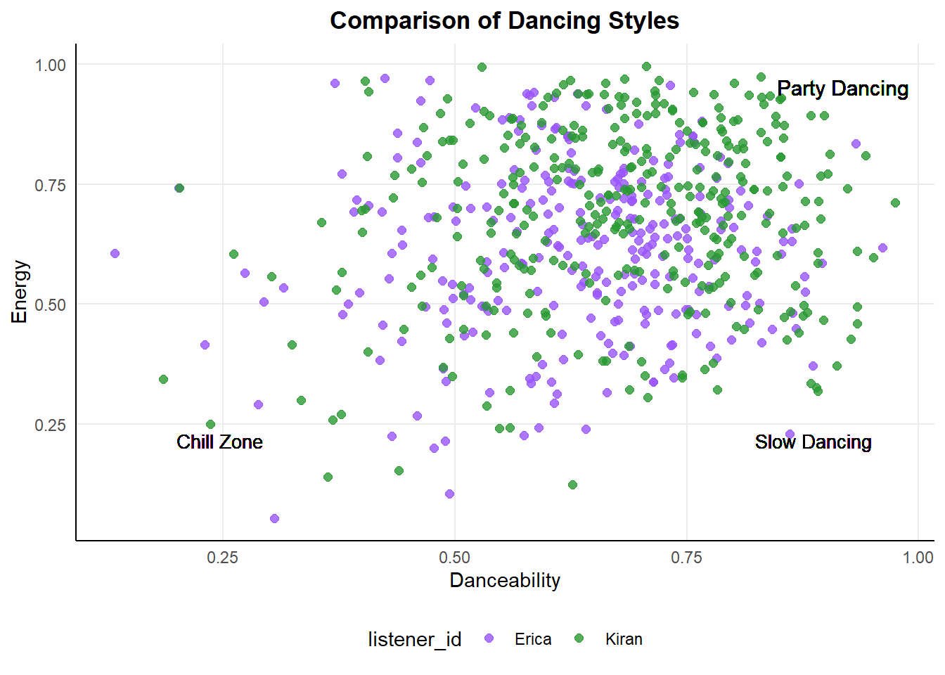 write_csv(ericas_audio, "ericas_audio.csv")My friend Kiran and I swapped data, which I will use to create a series of machine learning models to compare our music tastes. The goal is to create a model that can predict, using the audio features whose playlist it is from. I will go through four different types of models and at the end compare the metrics of each to decide which was most effective! The outcome variable will be the binary option of Kiran or Erica, set as listener_id.
